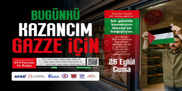 Esenler Belediyesi; AFAD, Esenler Kaymakamlığı, Esenler Birleşik Esnaf ve Sanatkârlar Odası (EBESO), Esenler Şoförler Esnaf Odası, Tekstilkent ve Giyimkent iş birliğiyle dünya tarihinin en acımasız soykırımlarından birinin yaşandığı Gazze için anlamlı bir bağış kampanyası düzenliyor. Bu kapsamda Esenler’de 26 Eylül 2025 Cuma günü, kampanyaya destek veren gönüllü esnaflardan yapılan alışverişlerin geliri Gazze’ye bağışlanacak. Gazze’de yaşanan insanlık dramına dikkat çekmek ve her yaştan Esenlerlinin bu konuda farkındalıklarını artırmak amacıyla gerçekleştirilecek kampanya, esnaf ve vatandaş dayanışmasının en güzel örneklerinden biri olacak.