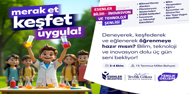 Esenler Bilim, İnovasyon ve Teknoloji Şenliği, toplumun bilimsel farkındalığını artırmayı, bilim-teknoloji-toplum etkileşimini güçlendirmeyi ve katılımcıların bilimsel düşünme becerilerini geliştirmeyi amaçlayan üç günlük bir etkinlik düzenliyor.